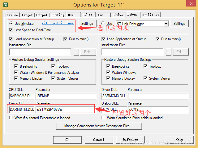 再配置debug调试文件 其中parameter 要与上图中的STMicroelectronics名字一致。Dialog.DLL不能写错