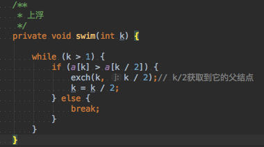 插入一个元素,我们会先把它放在数组的尾端,然后根据k/2找到它的父结点的下标,并和其比较,如果比a[k/2]大,那么就把父节点替换下来。这样我们就可以保证根结点a[1] (a[0]没有使用)永远是最大的元素。