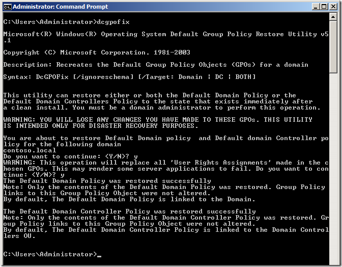 将GPO还原为默认设置的命令就像从命令行运行“ DCGPOFIX.exe”一样简单,并在出现提示时按两次“ Y”。