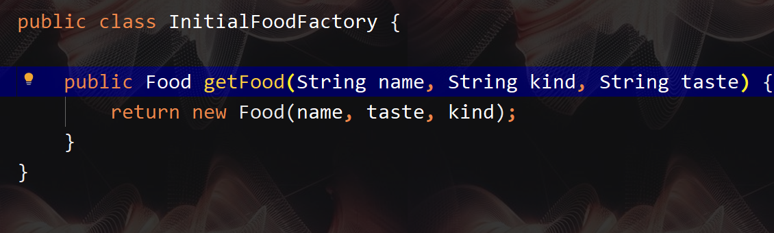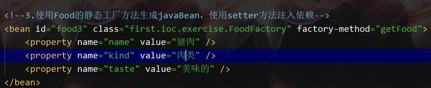 在xml中配置如下,class属性指向工厂类,factory-method指向返回JavaBean的静态方法。如果静态方法有参数,则可以通过<constructor-arg>子标签设置参数,<property>子标签设置的是静态方法返回的对象的属性。在这个示例中使用的是Food对象的属性