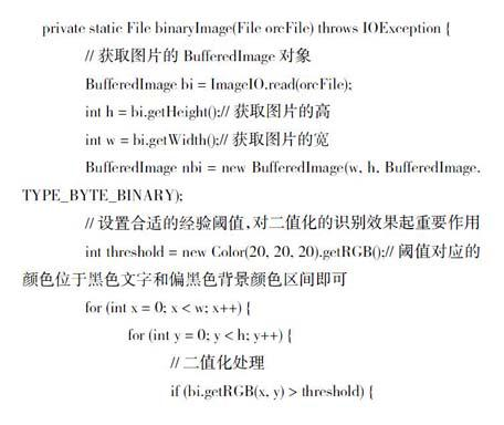 int threshold = new Color(20, 20, 20).getRGB();// 阈值对应的颜色位于黑色文字和偏黑色背景颜色区间即可
