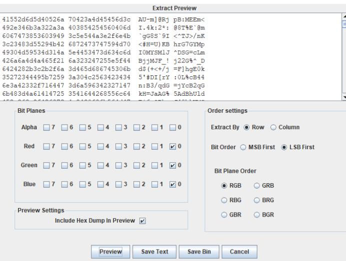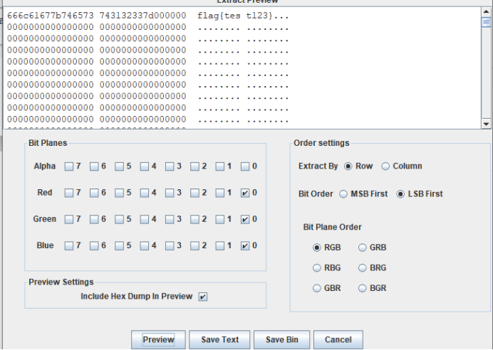 2、按照以往的题型,扫这个二维码就可以得到flag。但是这里有个坑,解码后的flag是假的。真的flag通过LBS隐写藏起来了。那怎么看是否存在LBS隐写呢?还是使用我们stegsovle隐写神器。点击程序最上面的Analyse,选择Data Extract 。然后如图所示勾选功能,Preview一下。得到flag。