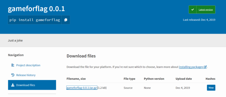 8、打开文本输入密码得到信息:Gameforflag,结合题目“pypi”,需要我们再pypi网站找到”Gameforflag“这个项目