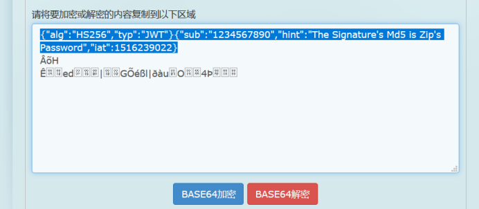 eyJhbGciOiJIUzI1NiIsInR5cCI6IkpXVCJ9.eyJzdWIiOiIxMjM0NTY3ODkwIiwiaGludCI6IlRoZSBTaWduYXR1cmUncyBNZDUgaXMgWmlwJ3MgUGFzc3dvcmQiLCJpYXQiOjE1MTYyMzkwMjJ9.wvVICsoUEmVkDxWAfBgDR9Xp32x88OB1h08UmTTenxA