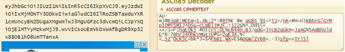 3、我们发现解密后的信息,是ey开头的。如果对jwt有所了解的,就该知道这里其实是加密后的jwt信息。不了解的也没关系,把它再进行一次base64解码。会得到以下结果:
