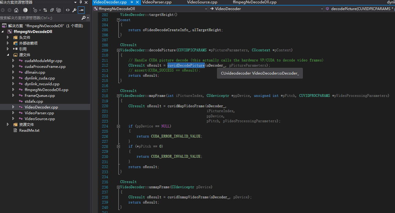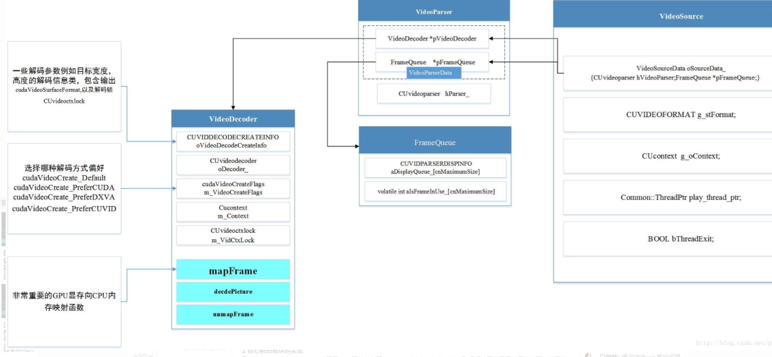 VideoDecoder 核心的硬件解码功能类,CUVIDDECODECREATEINFO oVideoDecodeCreateInfo_是创建解码信息结构体,CUvideodecoder oDecoder_是最内核的CUDA硬件解码器,VideoParser的解码功能实际上是在CUvideodecoder解码内核上封装实现的。