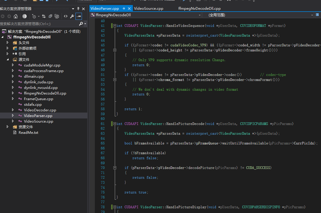 VideoParse 用来解析得到一帧帧的数据。 VideoParser的回调函数:HandleVideoSequence() 创建解码器或重设解码器HandlePictureDecode() 解码每帧视频数据HandlePictureDisplay() 转换,处理,显示解码后的数据。