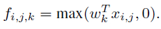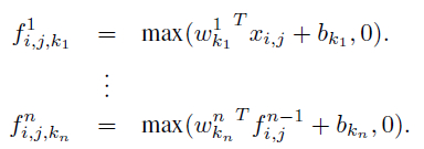 (i, j) 是特征图中像素的位置索引,x_ij 表示像素值,而 k 用于特征图通道的索引,W 是参数,经过 WX 计算以后经过一个 relu 激活进行特征的抽象表示。