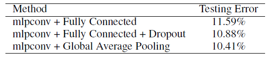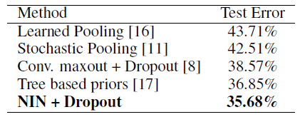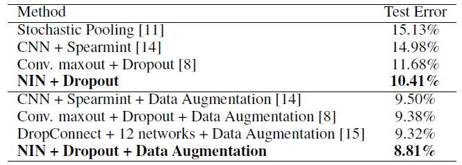 NIN + Dropout 得到 10.41% 的错误率,加上数据增强(平移和水平翻转)错误率降到了 8.81%