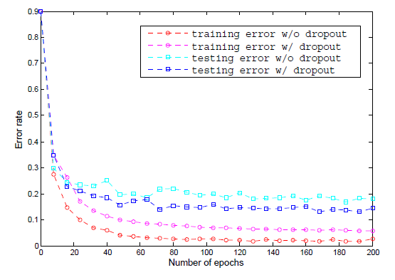 以上曲线对比了有无 Dropout 机制前200 epoch 的错误率,实验结果表明,引入Dropout机制,可以降低测试集 20% 的错误率