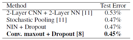 NiN + Dropout 效果在 MNIST 上效果比 maxout +Dropout 逊色了点