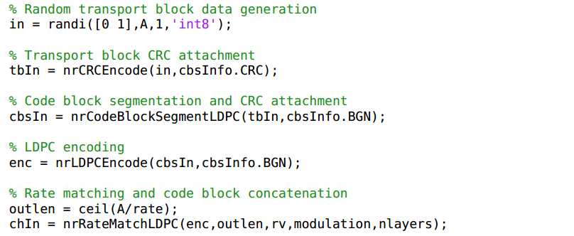 这个例子是5G Matlab工具包中的,突出讲解了5G NR下行和上行共享传输信道(DL-SCH和UL-SCH)的LDPC编码链路的整个过程。