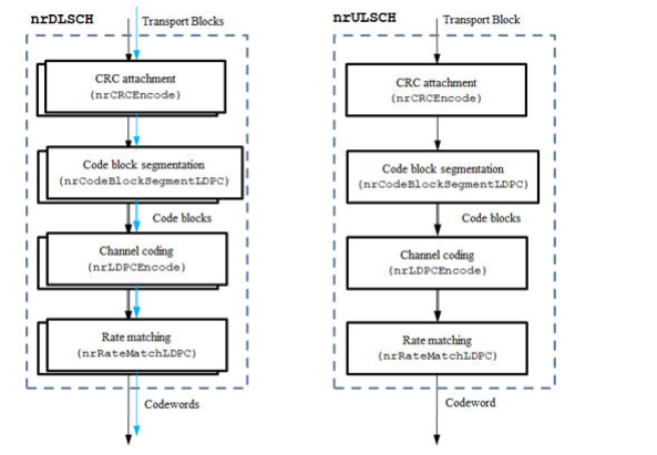 参考nrDLSCHDecoder和nrULSCHDecoder系统对象,它们封装了每个码字的接收处理,并附加了重新传输的软组合,以提高性能。