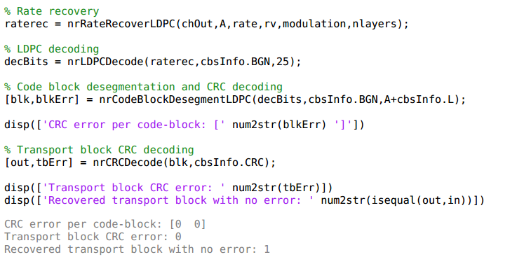 如图所示,在代码块和传输块级别上都没有CRC错误。这将导致传输块被恢复和解码,并且如预期的那样,对于无噪声信道没有错误。