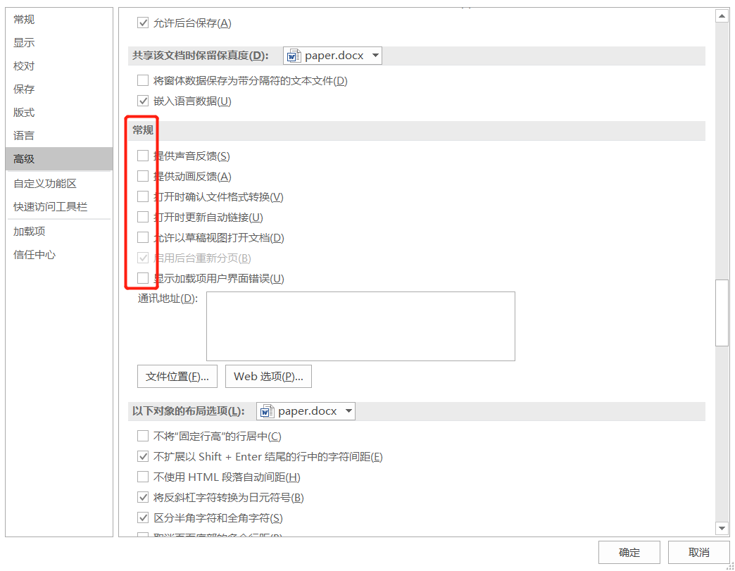 - 再点击选项菜单的“高级”--常规--取消所有选项的勾--完成;