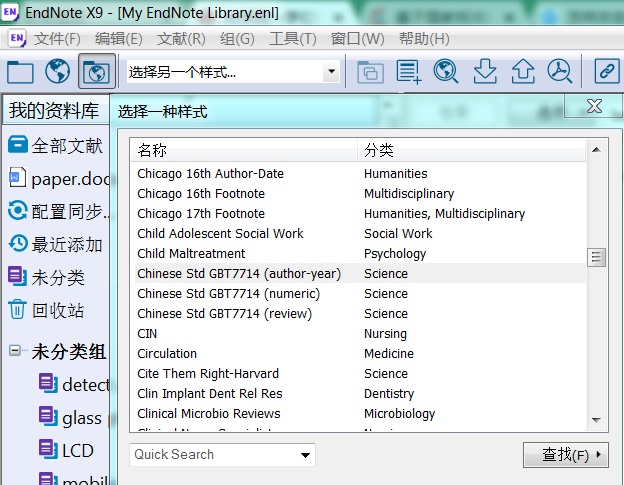 - 将下载好的.ens格式文件,拷贝到EndNote安装目录下的.\Styles\,打开EndNote,在文献输出格式(reference output style)中点击“选择另一个样式”,输入“Chinese”就可以看到已经有中国国标的文献格式可以选择;