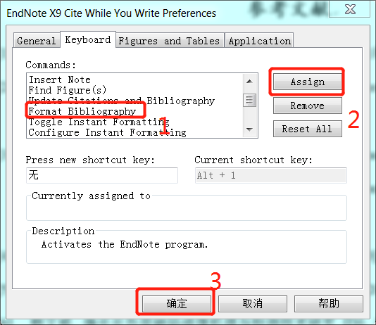解决办法:在Endnote里选工具 -- 边写边引[CWYW] -- 边写边引首选项设置 -- keyboard -- commonds下拉列表里面找到-format bibliography -- 右侧assign -- 确定。再重复上一步骤的操作,可以看到Configure bibliography中Format document栏中已经显示锁打开的word文件名,点击Layout就可以看设置参考文献的字体、行距、悬挂缩进量等。