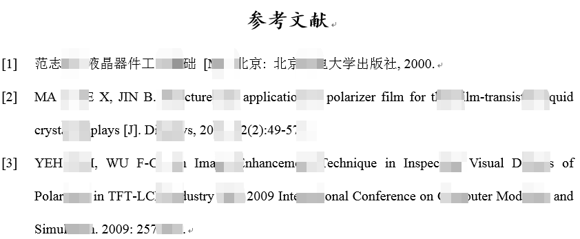 - 缩进方式:选择Chinese Standard GB/T7714 (numeric)输出格式,默认是没有缩进的,如下图;解决办法:打开endnote,文件 -- 编辑 -- 输出样式 -- 编辑“Chinese Standard GB/T7714 (numeric)” -- 参考文献:布局 -- 右下角悬挂式缩进:选择“全部段落”,更新word中的文献格式,发现已成功缩进;
