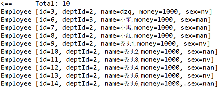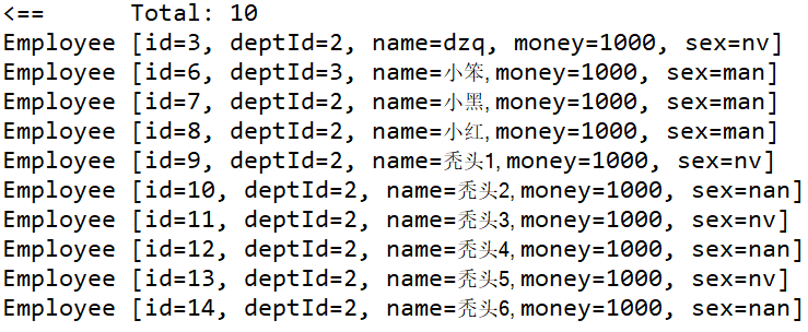//查询所有员工 (由于设置了分页拦截器,这里只会查询出10条记录)