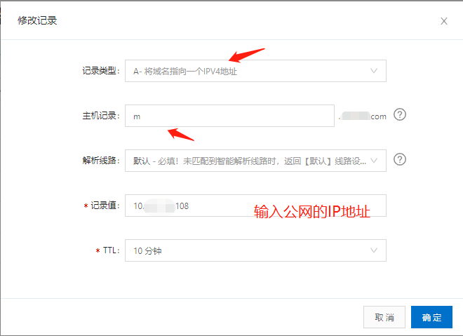 1. 在当前服务器上查看本机公网IP 2. 登录阿里云 并找到域名 菜单 3. 选择要解析的域名, 选择 解析 按钮 4. 选择添加记录 5. 选择A 记录类型, 配置要访问的二级域名,输入公网ip地址 其他默认即可 6.浏览器验证 (前提服务器已经安装了Nginx了) 来源:CSDN作者:潇凝子潇链接:https://blog.csdn.net/xu990128638/article/details/103984309 标签 阿里 阿里云域名 域名绑定 域名服务器 服务器类型 域名 公网ip