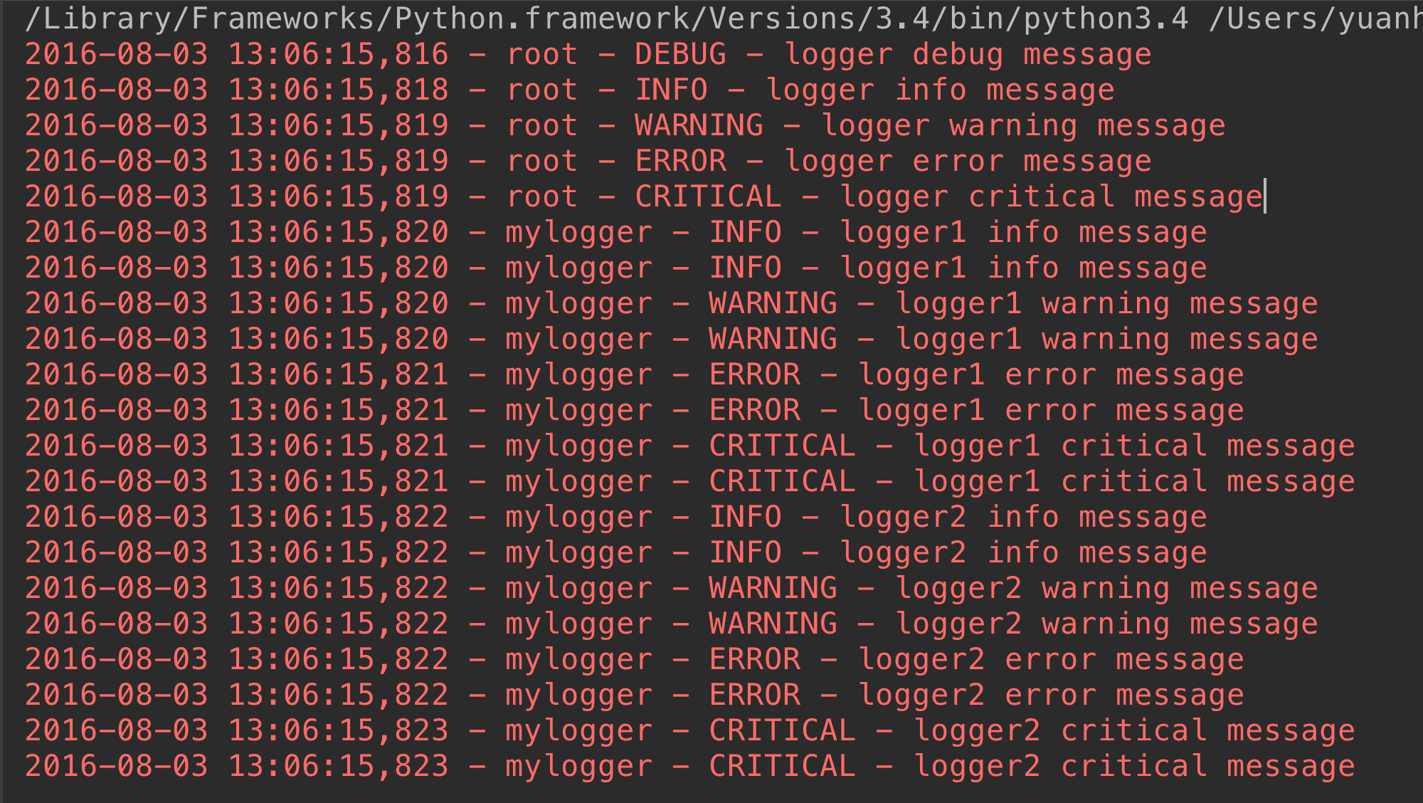 上述几个例子中我们了解到了logging.debug()、logging.info()、logging.warning()、logging.error()、logging.critical()(分别用以记录不同级别的日志信息),logging.basicConfig()(用默认日志格式(Formatter)为日志系统建立一个默认的流处理器(StreamHandler),设置基础配置(如日志级别等)并加到root logger(根Logger)中)这几个logging模块级别的函数,另外还有一个模块级别的函数是logging.getLogger([name])(返回一个logger对象,如果没有指定名字将返回root logger)