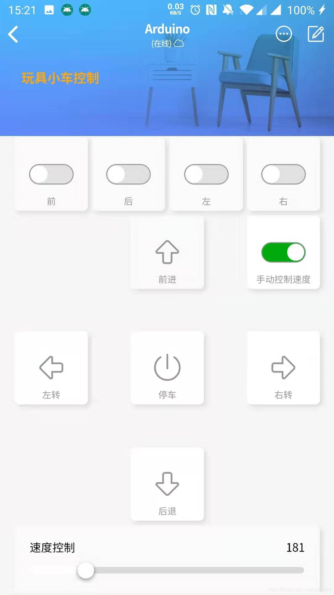 前后左右按键可以控制方向,中间停止按键停车使用,速度控制滑条来控制速度,当手动速度打开时可以来控制速度,关闭时使用默认速度行走