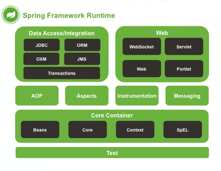 上图Spring 5的模块结构图,而这些组件被分别整合在核心容器(Core Container)、AOP(Aspect Oriented Programming)、数据访问集成(Data Access/Integratioin)、Web、报文发送(Messaging)、Test等模块。