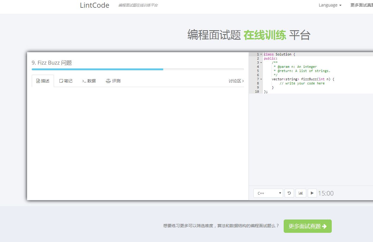 当我们在学习了一段时间的编程,想要知道自己的能力是否能够达到公司的要求的时候。可以用用这个网站进行测试。它里面有一些互联网公司的面试真题,可以自行根据难度和知识点检验自己的学习成果,及时知道自己哪里有欠缺。