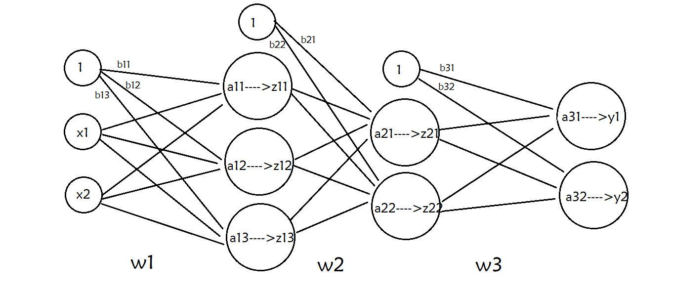 x1,x2表示整个神经网络的输入信号,y1,y2表示整个神经网络的输出信号。内含1的神经元以及bij标识是为了表示偏置,bij表示第i层偏置的第j个元素。