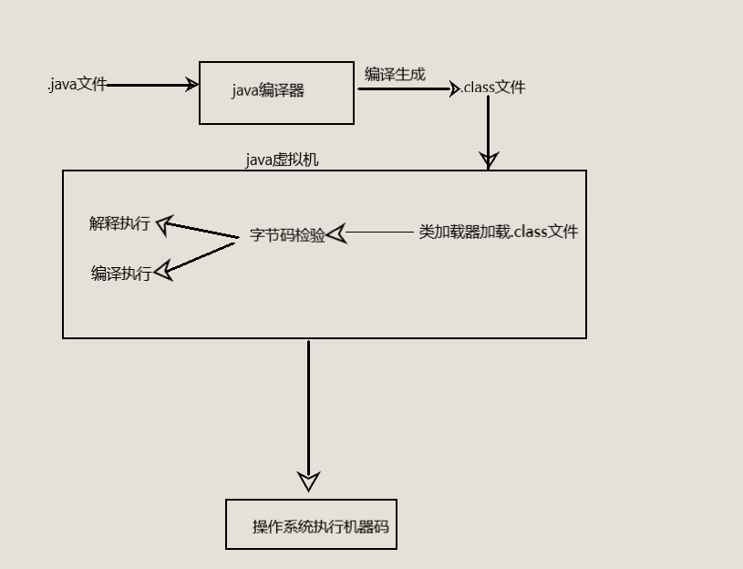 (1)java程序运行过程:在java语言开发环境中编写.java文件通过java编译器编译形成.class(字节码),JVM使用类加载器加载.class文件,类加载器完成后,进行字节码检验,字节码检验通过后,JVM解释器会把字节码翻译成机器码交由操作系统执行。
