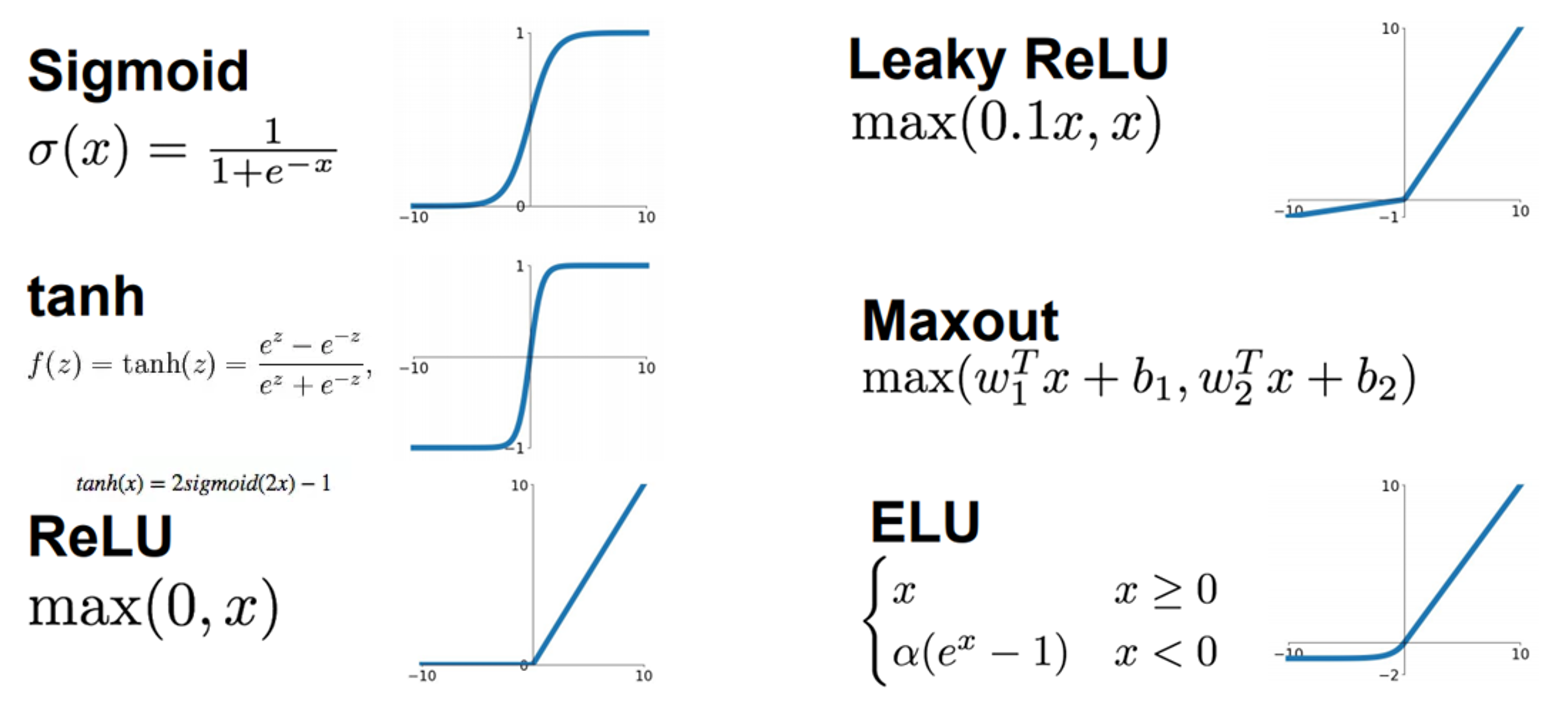 除了Sigmoid函数,还有其他的非线性激活函数。它们优缺点的比较在网上有很多,这里不一一赘述。