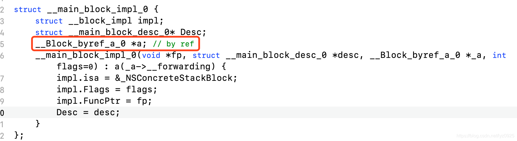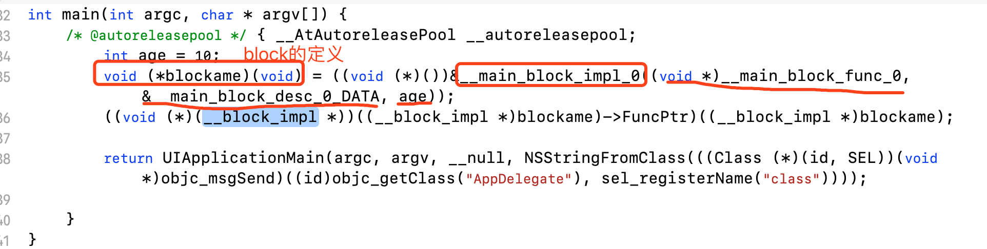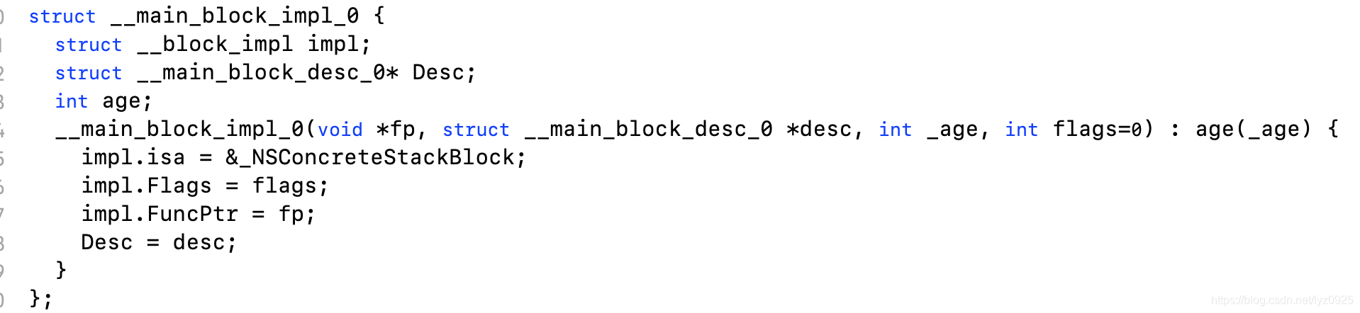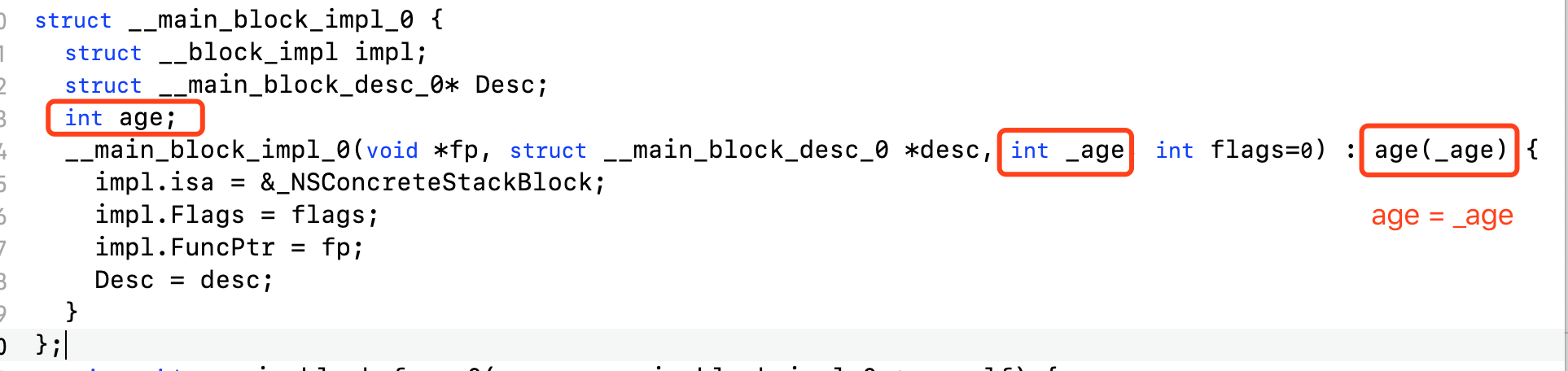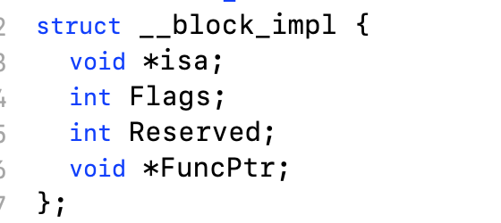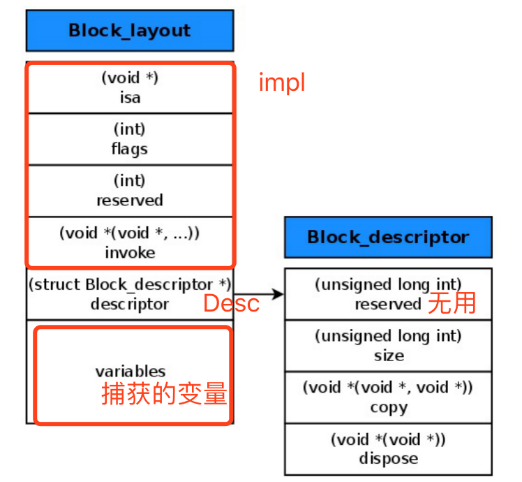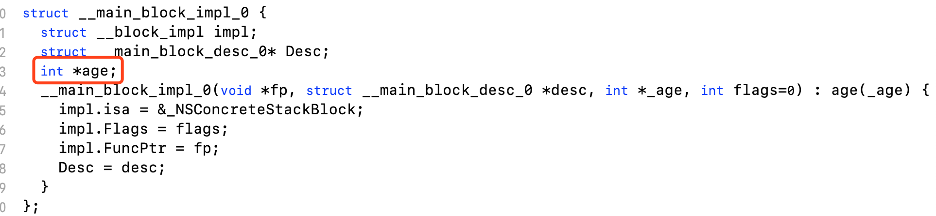 其中,__main_block_impl_0这个结构体有三个属性:__block_impl结构体类型的 impl、__main_block_desc_0结构类型的desc,还有外部获取到的变量 age。从定义中可知:把fp赋值给了impl的FuncPtr,把desc赋值给了结构体本身的Desc。那么__block_impl结构体定义如下: