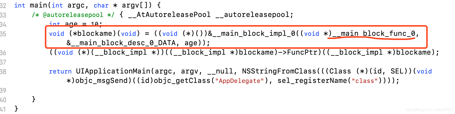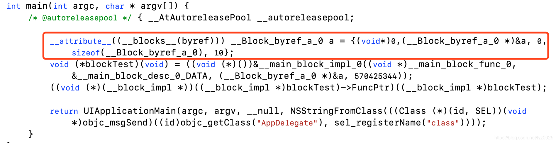__block_impl内部有个isa指针,也可以说明,block是一个对象。因为从__main_block_impl_0这个结构体定义中可知把fp赋值给了impl的FuncPtr,那么这个fp的值是什么呢?回到这个图: