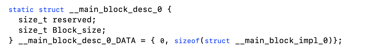 可知__main_block_desc_0_DATA 这个参数的类型是__main_block_desc_0 (命名规则如下:__XXX类名_block定义所在的方法名_block_desc_0 )的结构体类型,里面主要存储的是reserved(是否持有)和block结构体本身的大小。