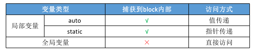 为了保证block内部能够正常访问外部的变量,block有个变量捕获机制。如下图: