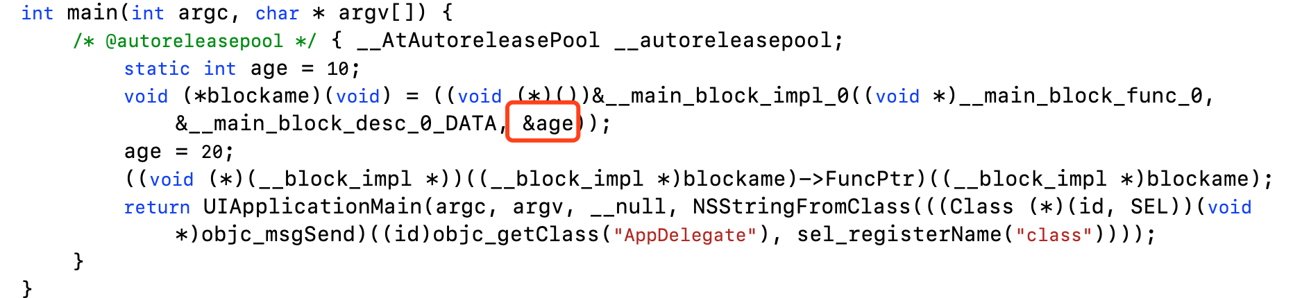 与block捕获auto变量不一样的地方是,捕获static的变量时,传入的不是age的值,而是age的地址。查看生成的__main_block_impl_0 的结构体如下: