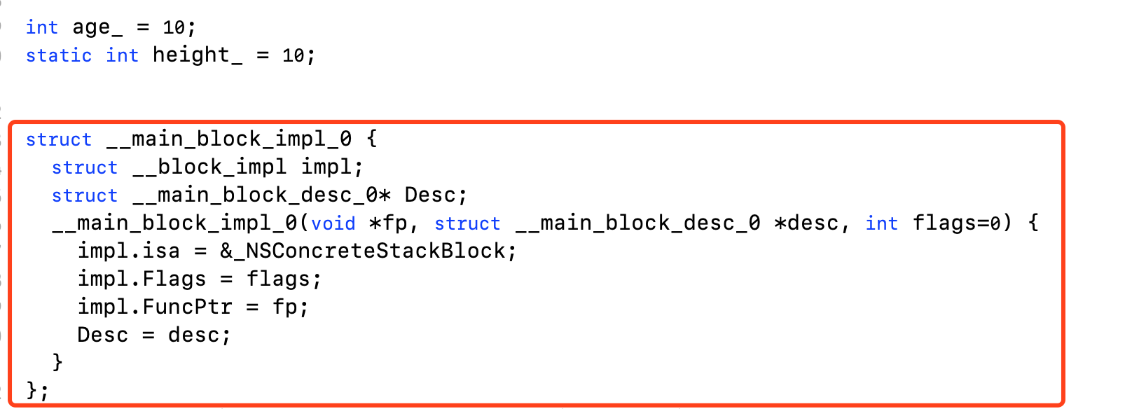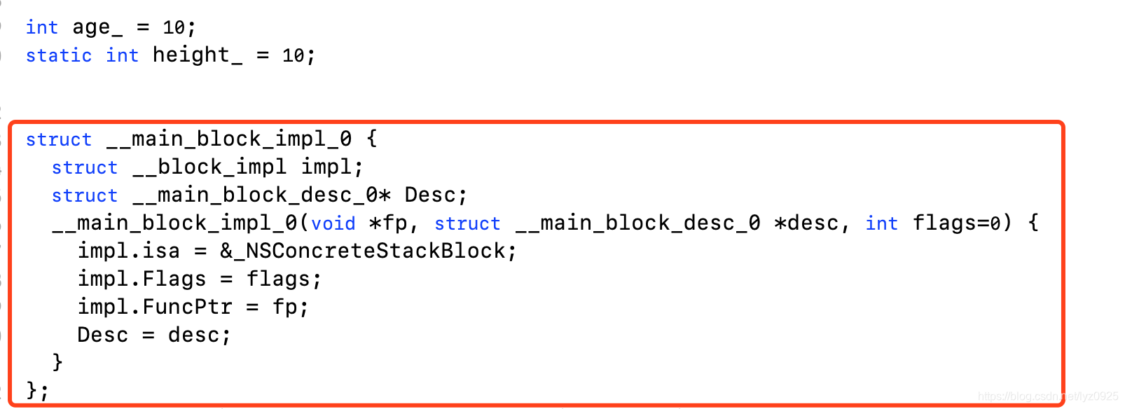从上图中,我们可知,在构造这个block的结构体的时候,并没有把age_和height_的值传入到__main_block_impl_0的构造方法中,查看__main_block_impl_0的结构体的定义如下: