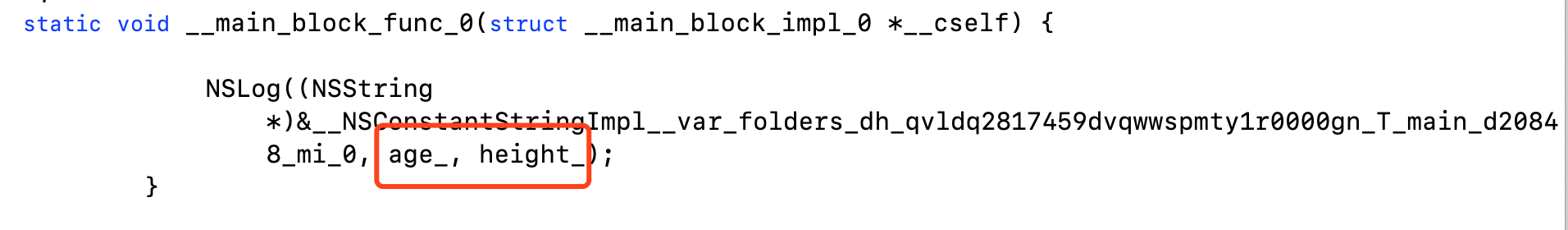 从上图可知,age_和Height_ 并没有捕获到__main_block_impl_0 的结构体内部中,所以全局变量,并不会被block捕获。查看block封装的__main_block_func_0 的函数,如下: