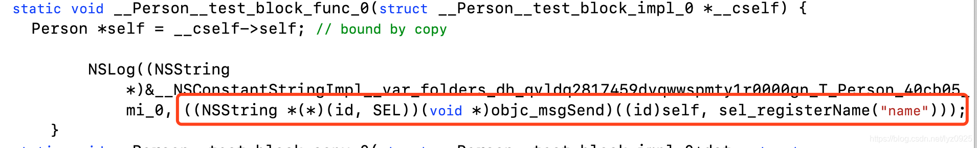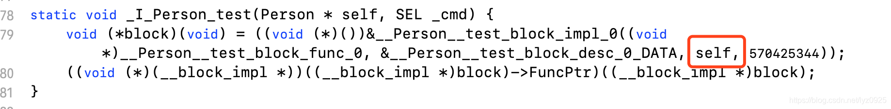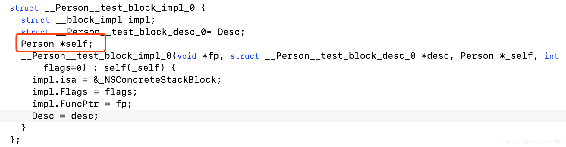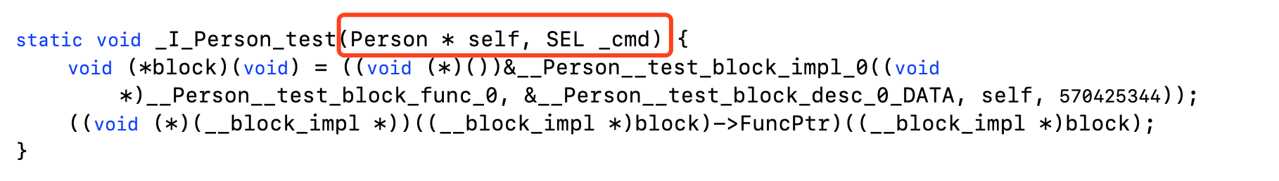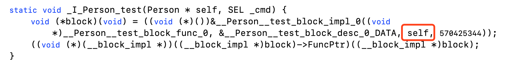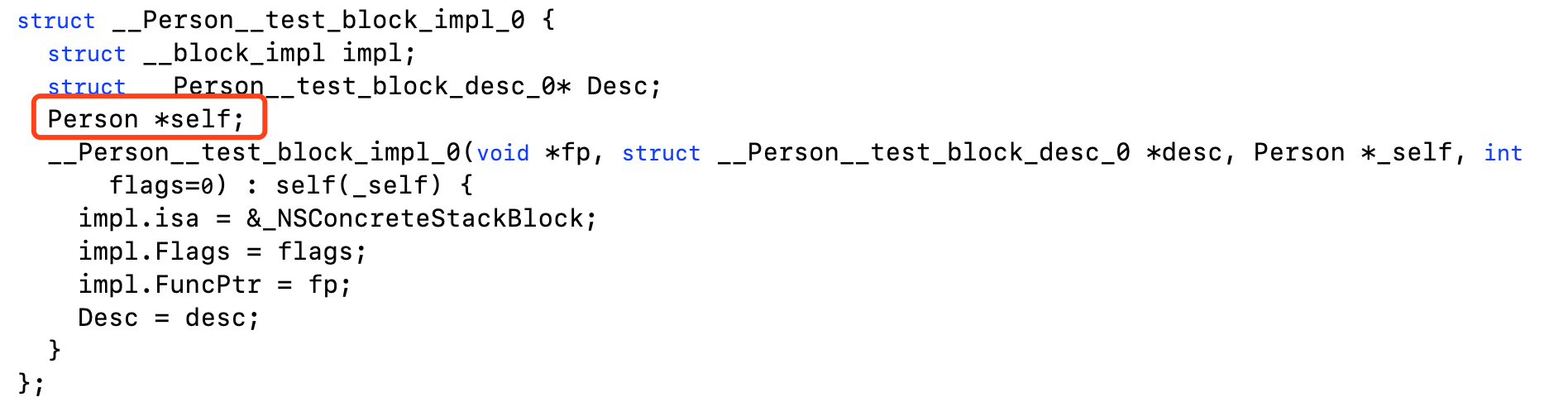 首先可以看到是将self传入到构造函数里,而不是self.name传入构造函数里。其次,查看__Person_test_block_impl_0的结构体如下:
