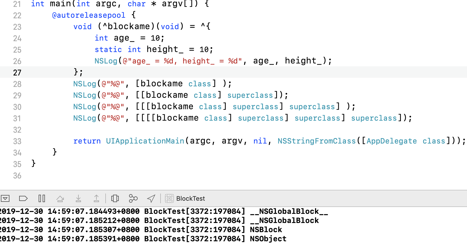 所以,block是一个将block大括号内部的方法封装成__main_block_func_0的函数存储在__main_block_impl_0的结构体对象中。