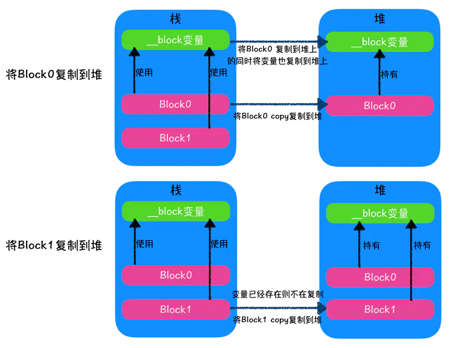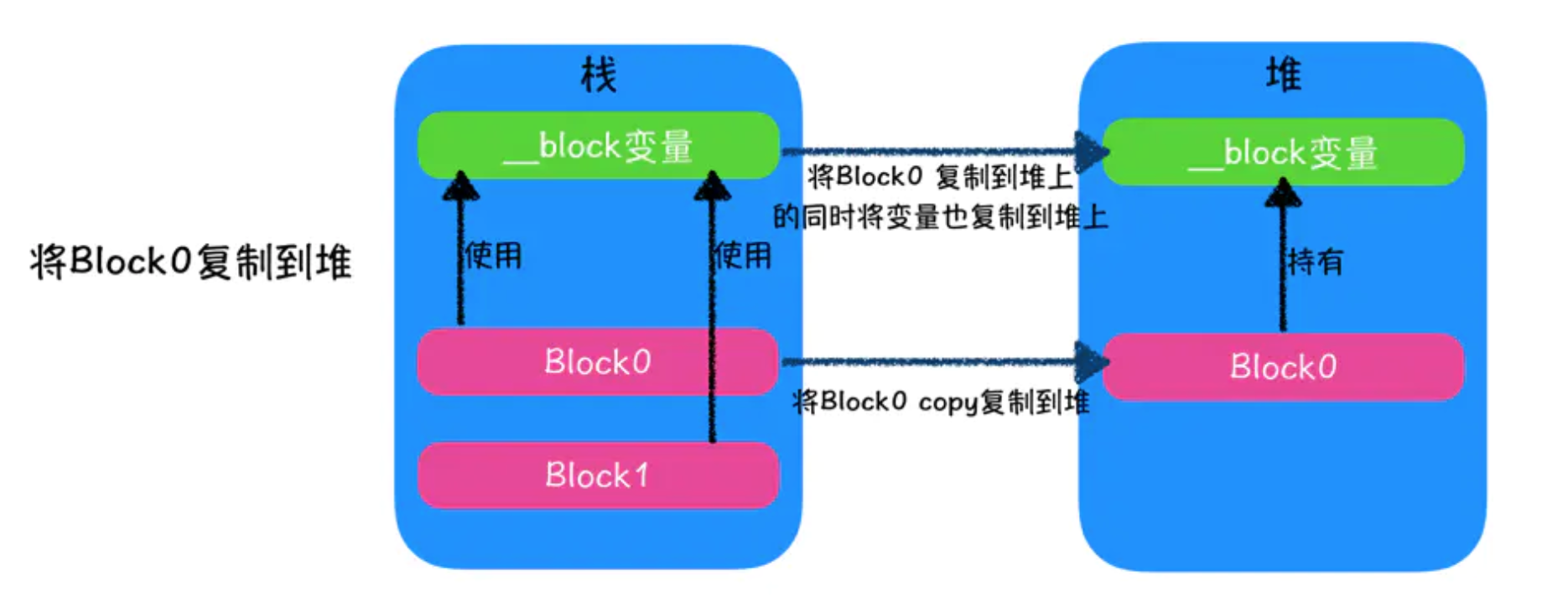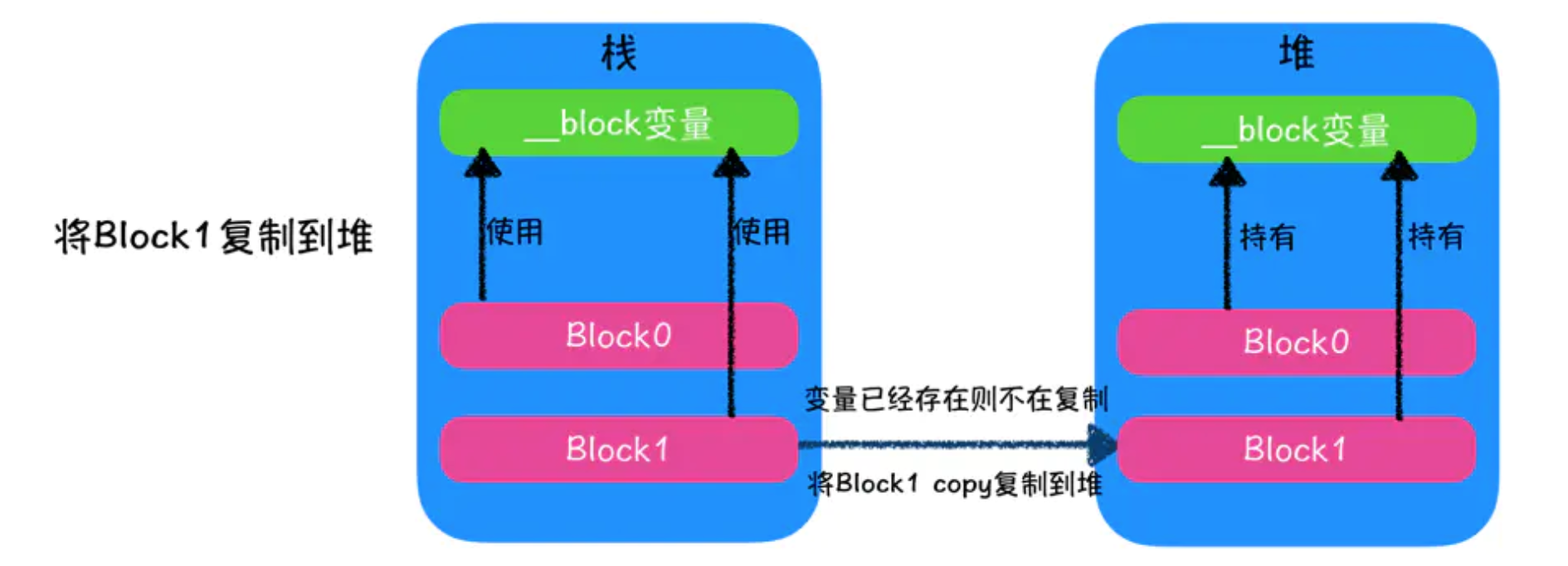 __NSStackBlock__调用了copy就会将原本存放在栈区上的block复制到堆上,同时栈区的block会被销毁。NSGlobalBlock 进行copy操作后,依然是NSGlobalBlock。