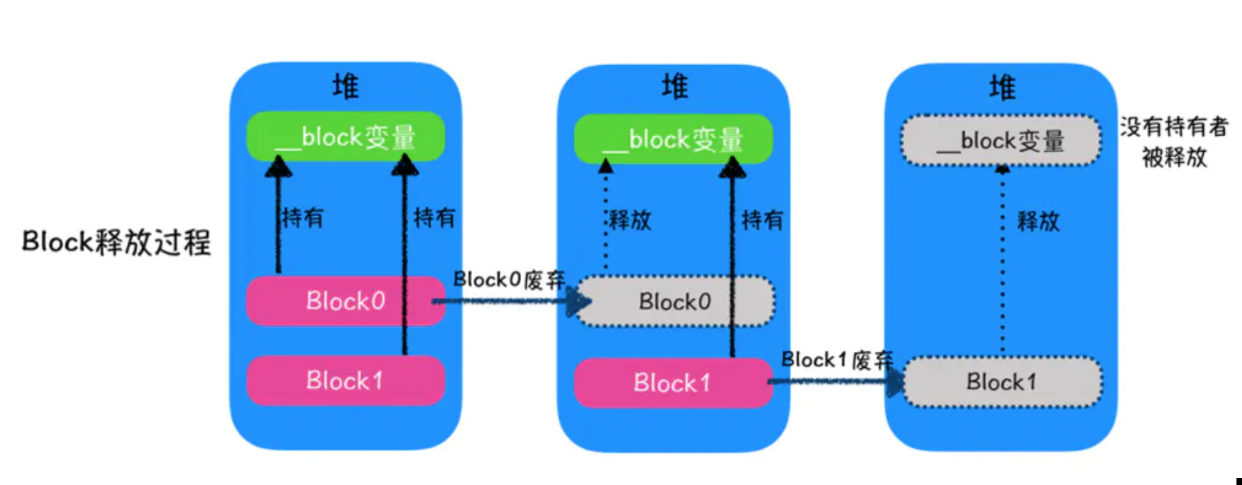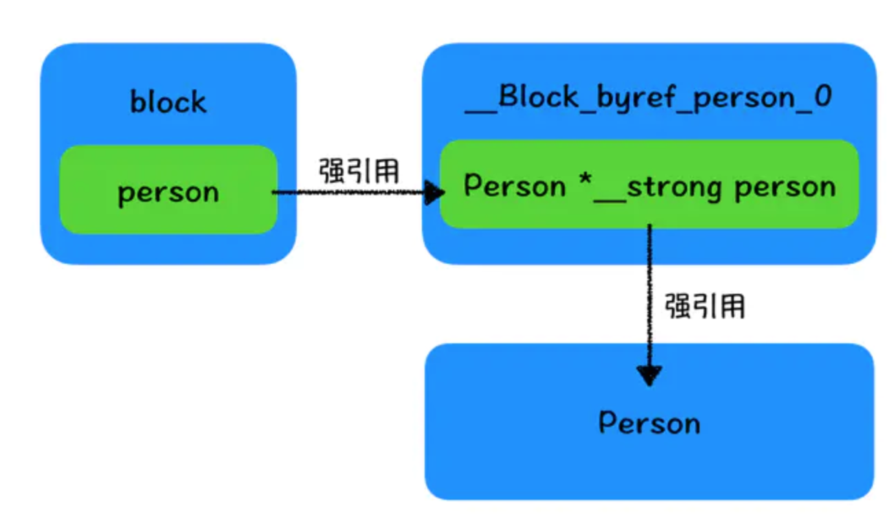 当block从堆中移除的时候。会调用dispose函数,block块中去除对__Block_byref_person_0 *person;的引用,__Block_byref_person_0结构体中也会调用dispose操作去除对Person *person;的引用。以保证结构体和结构体内部的对象可以正常释放。
