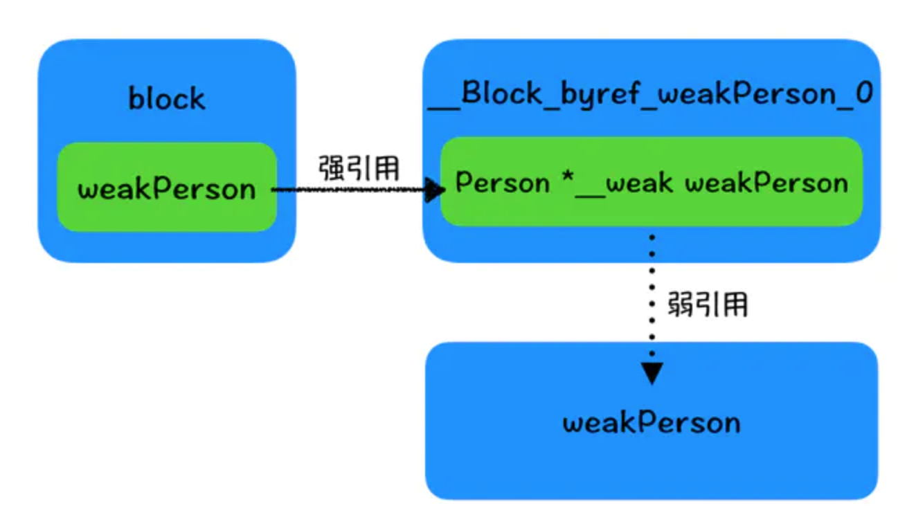 __main_block_impl_0中没有任何变化,__main_block_impl_0对weakPerson依然是强引用,但是__Block_byref_weakPerson_0中对weakPerson变为了__weak指针。