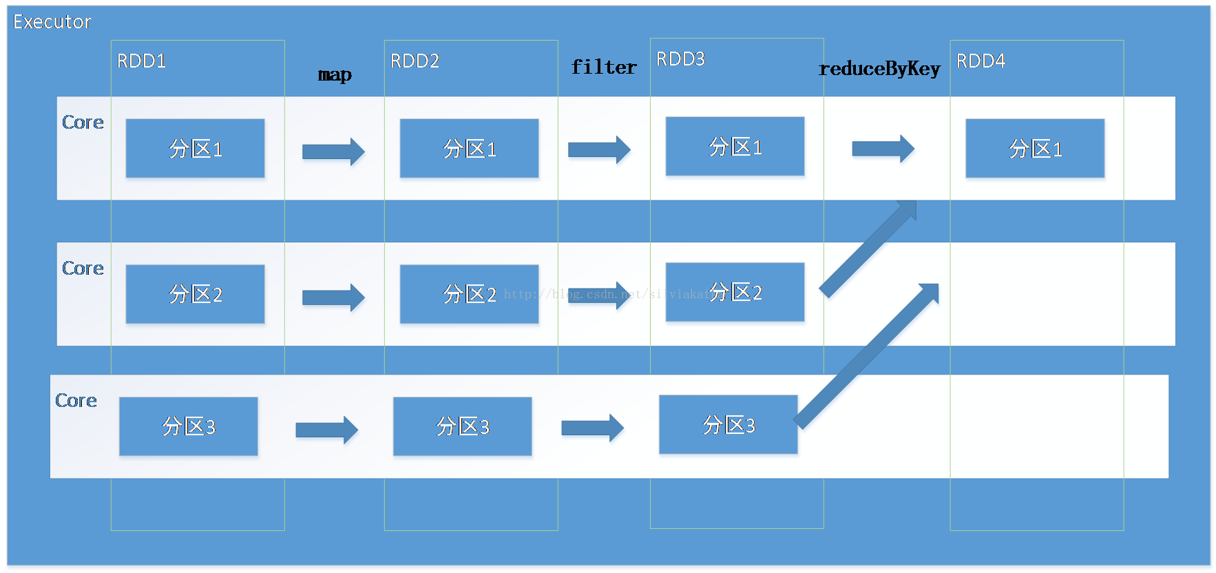 (1) narrow dependencies可以支持在同一个集群Executor上,以pipeline管道形式顺序执行多条命令,例如在执行了map后,紧接着执行filter。分区内的计算收敛,不需要依赖所有分区的数据,可以并行地在不同节点进行计算。所以它的失败恢复也更有效,因为它只需要重新计算丢失的parent partition即可,