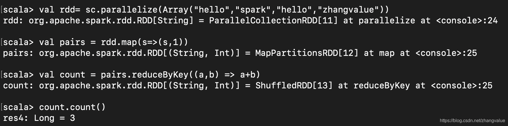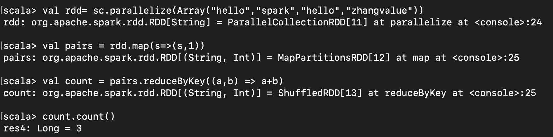 scala> val rdd= sc.parallelize(Array("hello","spark","hello","zhangvalue"))