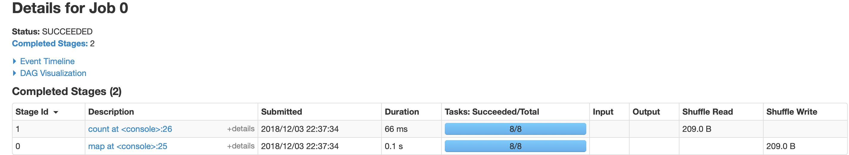 parallelize和map被分在一起,为stage0,map最后进行了ShuffleWrite