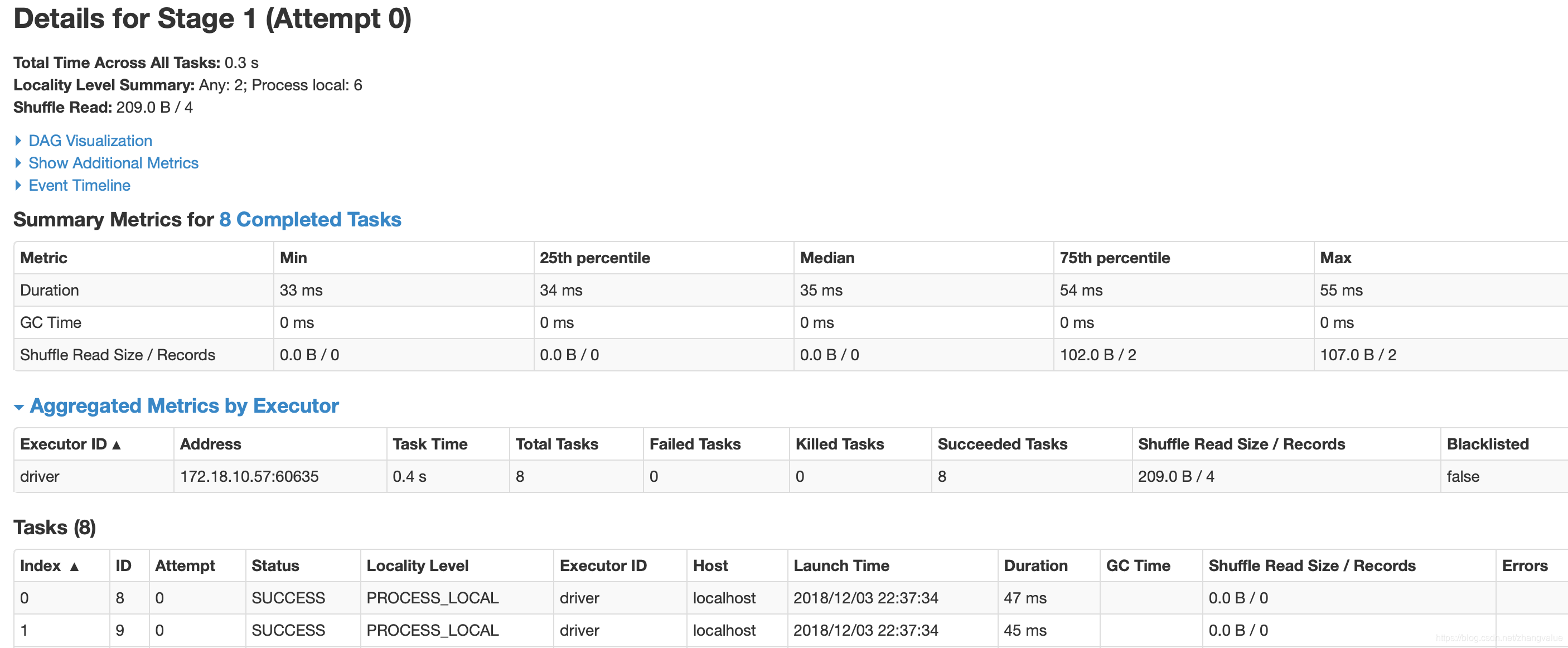 Stage0的tasks如下图,两个partitions(两个tasks)都进行了shuffle write。两个task互相独立,并不需要依赖彼此做完或者怎样,所以他们在一个stage里面并发执行
