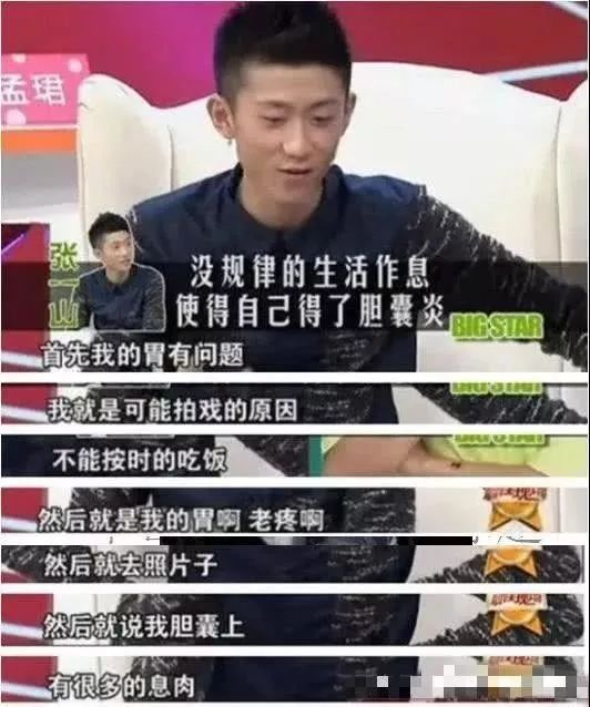 张一山一个工作接着一个工作的转换,作息时间完全被打乱,多年的胃病最终变成了胆囊息肉,他曾在节目录制现场因胃病突发被紧急送往医院。