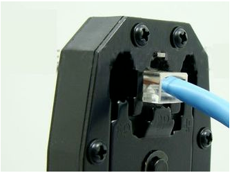 5、把带网线的水晶头放入网线钳的压线槽内,紧紧用力握住,以保证金属针脚能够和网线良好接触。