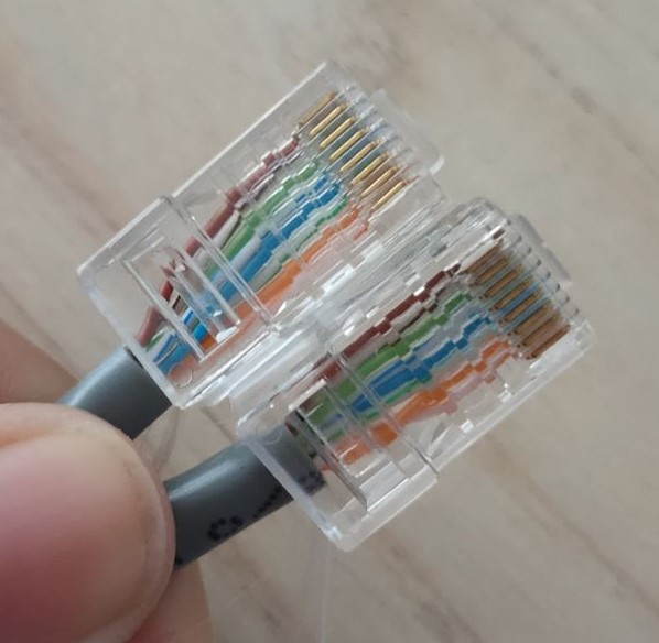 3、将它们按照这样顺序进行排列:橙白、橙、绿白、蓝、蓝白、绿、棕白、棕。再用网线钳剪齐。